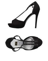 Altezza tacco 12 cm; Altezza del plateau 2,5 cm; Composizione: Fibre tessili; tacco a stiletto, tinta unita, logo, fibbia, raso, strass, punta tonda.