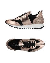 Composizione: Fibre tessili; punta tonda, logo, effetto laminato, fantasia bicolore, similpelle, applicazioni in metallo, inserti elastici.
